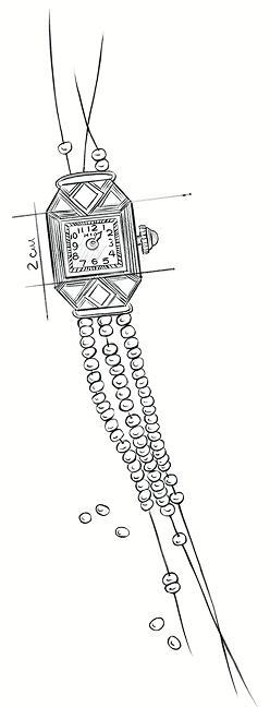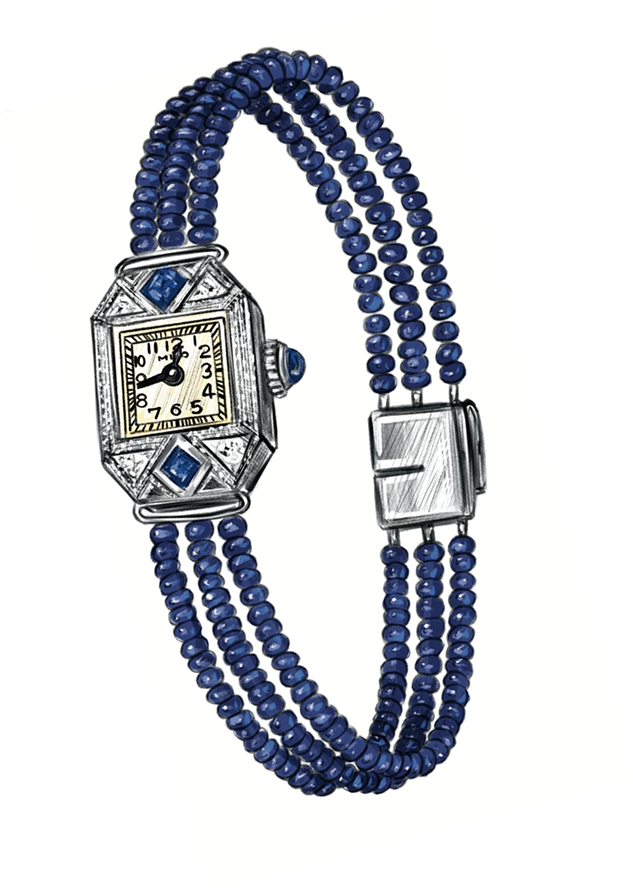 Часы изготовлены из платины, инкрустированы сапфирами и бриллиантами. Оснащены механическим механизмом. На момент поступления у часов отсутствует ремешок, имеется скол на одном из сапфиров. Механизм не функционирует.
